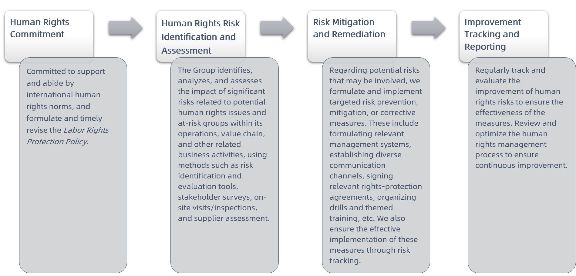The Group has formulated and issued the Labor Rights Protection Policy, which clarifies the process for identifying and managing human rights risks and standardizes the grievance and corrective procedures, aiming to comprehensively safeguard all labor rights. The Group has developed a human rights due diligence process, including human rights commitment, human rights risk identification and assessment, risk mitigation and remediation, and improvement tracking and reporting. In 2024, there were no incidents of employee discrimination, harassment, forced labor, child labor, etc.