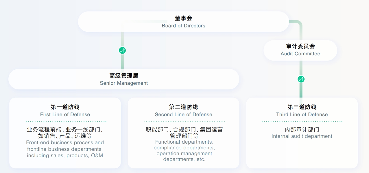 世纪互联高度重视风险管理和内部控制对集团运营的重要性。我们遵循《萨班斯-奥克斯利法案》要求,基于反虚假财务报告委员会下属的发起人委员会(以下简称“COSO”)发布的《内部控制整合框架》(以下简称“框架”)并结合集团业务特点,建立并完善风险管理及内部控制系统,对运营过程中的财务和非财务风险进行识别和预警,以形成有效的风险防控机制。我们建立了风险管理三道防线,把风险管理融入企业管理和业务流程中,通过明确董事会、管理层、内控团队及外部审计机构在风险防控体系中的角色与责任,保障风险管理体系健全有效。