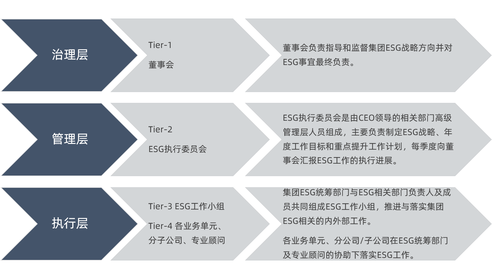 集团建立了董事会负责、管理层领导、跨部门配合及上下联动的ESG管治架构,并将ESG管理理念融入到集团重要决策过程中,推动企业高质量发展。董事会是集团ESG最高决策机构负责全面指导与监督ESG工作,保证ESG管理流程的有效性以支持ESG表现的持续优化与提升。